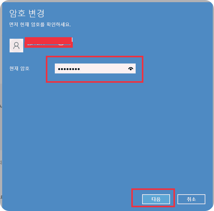 4.암호변경 창이 뜨면 기존 암호를 적은후 다음을 클릭합니다.