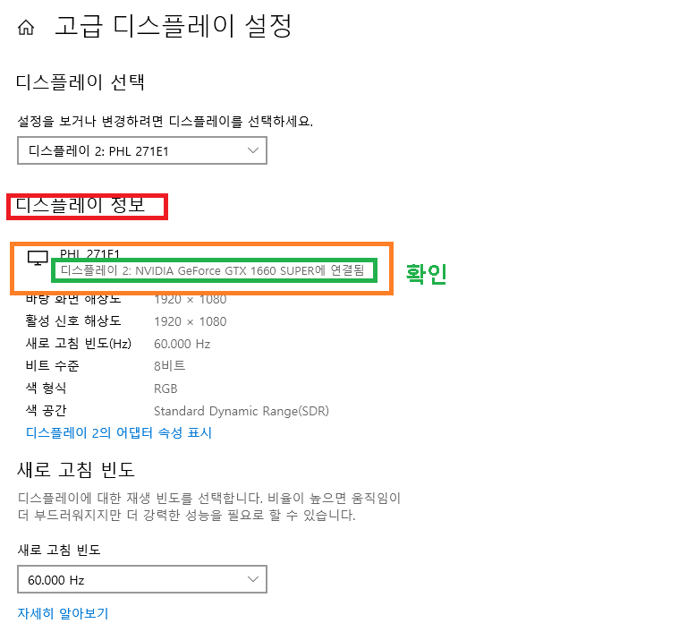 고급 디스플레이 설정 화면에서 설치된 그래픽카드를 확인합니다.