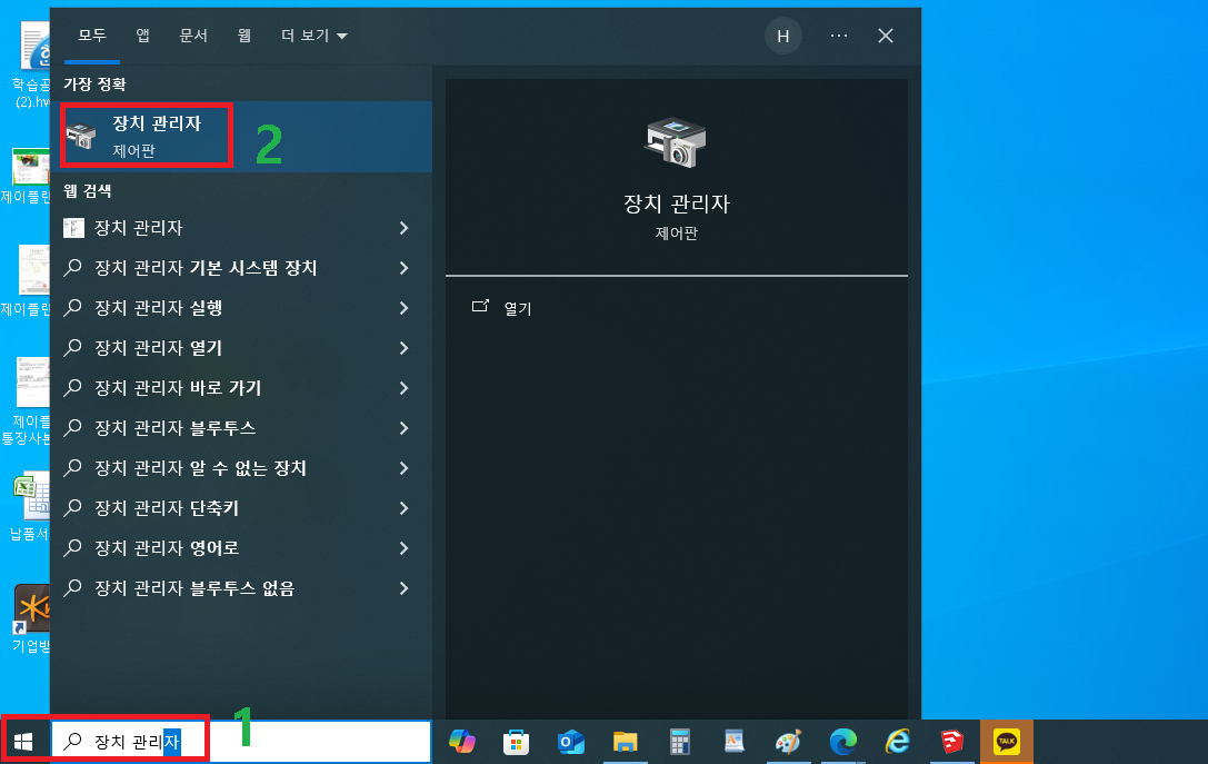 1. 첫번째 방법 : 화면의 좌측하단 윈도우 로고 옆 돋보기에 장치 관리자를 입력합니다. (장치 관리자에서 장치 띄우고 관리자를 입력하면 바로 나타납니다. 가끔 장치관리자를 이어서 써서 나타나지 않는다고 하는 분들도 있음)