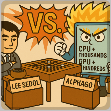 | 바둑 | 알파고 (AlphaGo) | 2016 | 두뇌 1개, 한 명의 인간 | 수천 개 CPU & 수십~수백 개 GPU, 전 세계 기보 데이터 학습 | 연산 자원, 정보량, 경험치에서 압도적 격차 |
