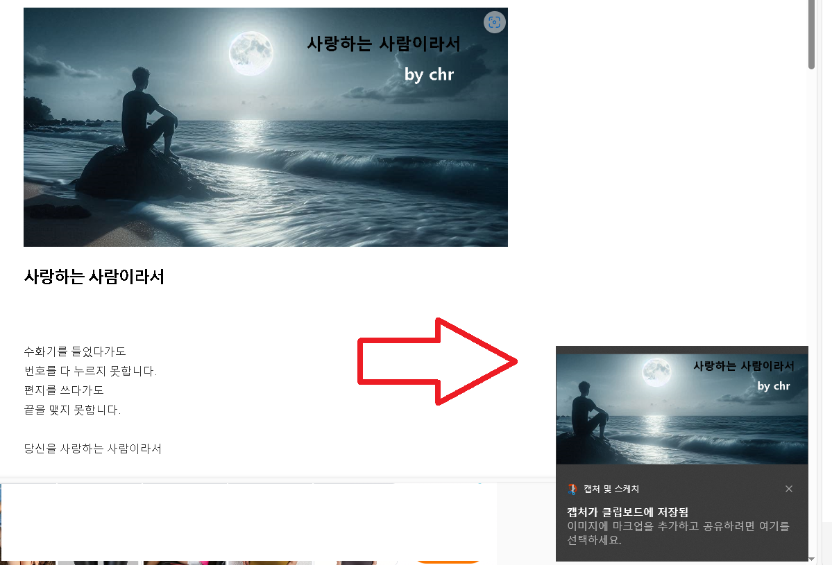 이제 지정한 부분이 클립보드에 저장 되었음으로 작성중에 블로그나 웹사이트에 Ctrl(컨트롤 키) + v 로 붙여넣기 해서 바로 사용할 수 있습니다. 자유형 캡쳐도 사각형 캡쳐 사용 방식과 동일하게 적용하면 됩니다.