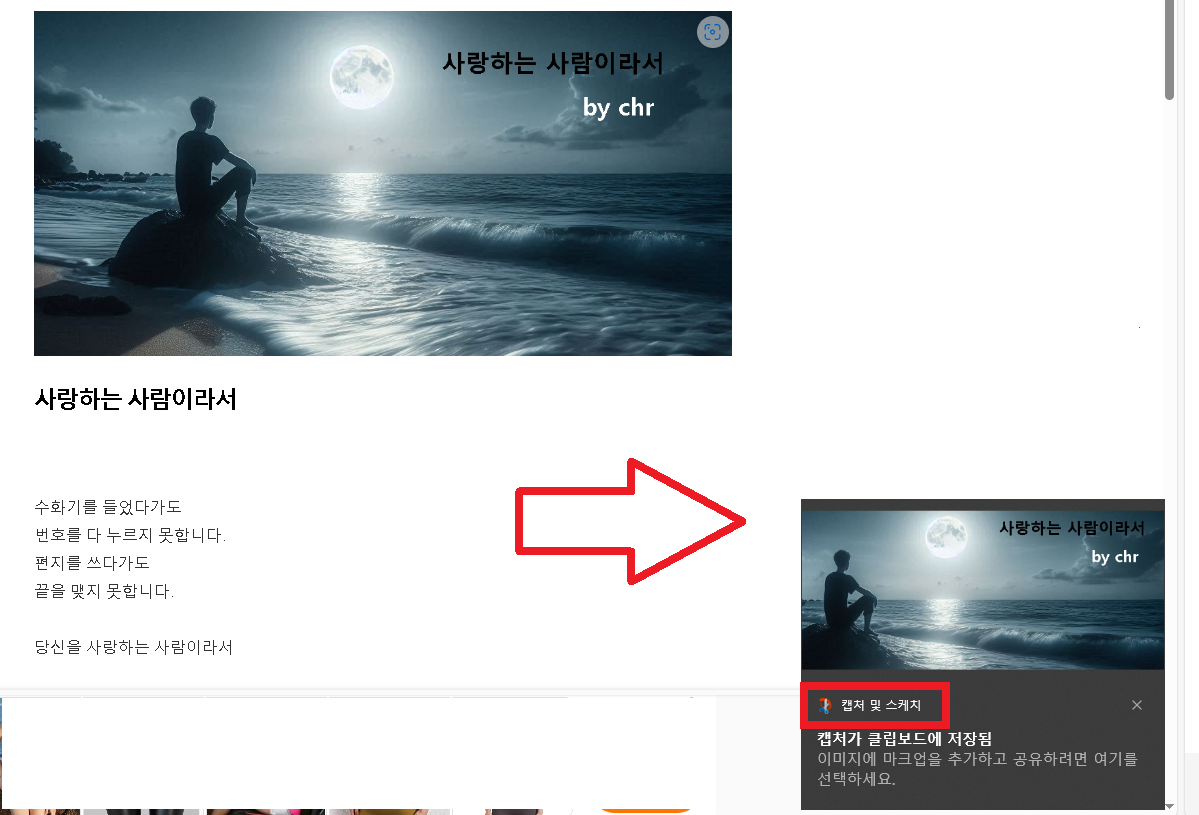 위 이미지에서 보는 것 처럼 캡쳐하고자 하는 부분을 지정하면 화면 하단에 캡쳐 및 스케치 가 클립보드에 저장되었다고 나옵니다.