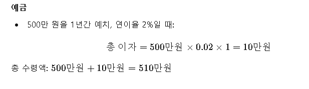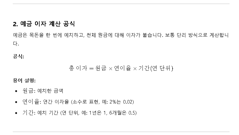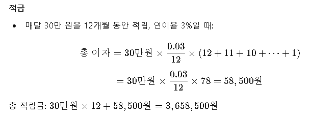 | 이자 계산식 | 월별 납입금에 따른 누적 합산 이자 계산 | 원금 × 이자율 × 기간 (단순 계산) |