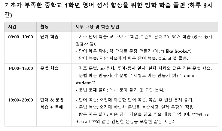 기초 영어 실력이 부족한 중학교 1학년 학생에게 겨울방학은 부족한 부분을 보완하고 2학년 진학 준비를 할 수 있는 중요한 시기입니다. 특히 영어는 단기간에 성적을 올리기 어려운 과목이므로 체계적인 계획을 세우고 꾸준히 실천하는 것이 중요합니다. 단어와 문법을 중점적으로 다루고, 학습의 기초를 탄탄히 다지는 데 초점을 맞추며, 3시간 학습을 하루에 분배하여 지속적으로 실력을 향상시킬 수 있도록 설계되었습니다.