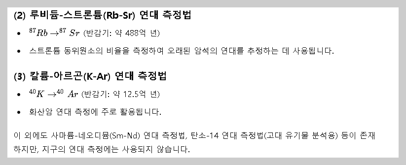 이 외에도 사마륨-네오디뮴(Sm-Nd) 연대 측정법, 탄소-14 연대 측정법(고대 유기물 분석용) 등이 존재하지만, 지구의 연대 측정에는 사용되지 않습니다.