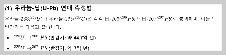- 우라늄-238은 시간이 지나면서 납-206으로 변하는데, 이 변환 과정(반감기)이 약 44억 7천만 년에 걸쳐 일어납니다.