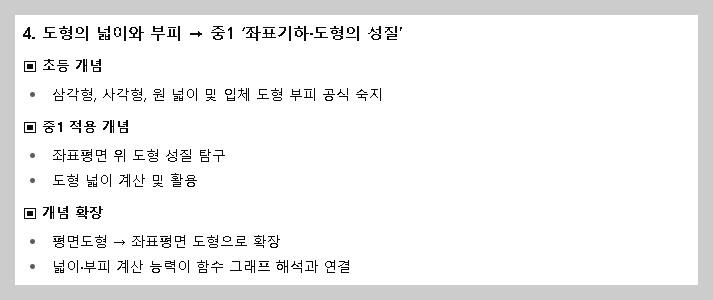 | 4 | 도형의 넓이와 부피 | 좌표기하·도형의 성질 | 넓이·부피 계산 능력이 좌표 평면 도형 이해와 연결 |