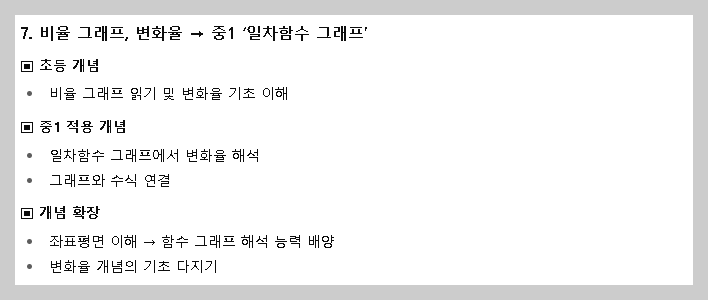 | 7 | 비율 그래프, 변화율 | 일차함수 그래프 | 비율과 변화율 개념이 함수 그래프 해석의 기초 |