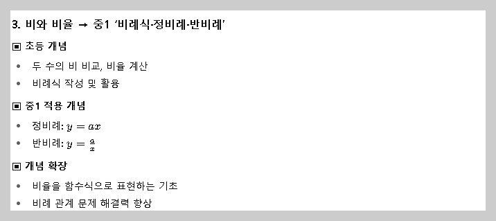 | 6 | 비례식과 비례배분 | 비례·함수 | 양의 비례 관계를 식과 함수로 체계적으로 표현 |