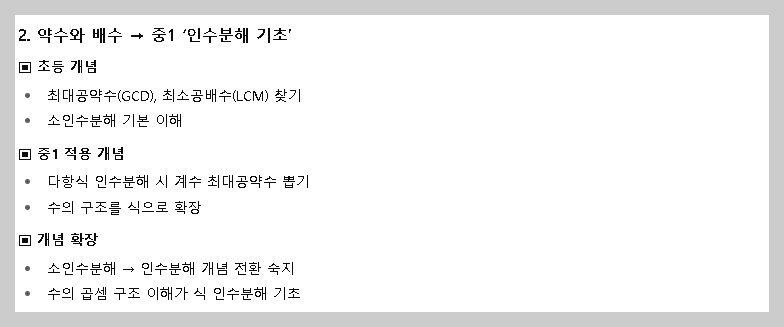 | 초등 고학년 수학과 중학교 1학년 수학 연결 2단원 : 약수와 배수 → 인수분해 기초 (0) | 2025.09.11 |