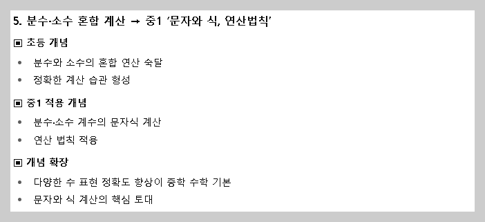 | 5 | 분수·소수 혼합 계산 | 문자와 식, 연산법칙 | 다양한 수 형태 연산 정확도 향상이 문자식 계산에 필수 |