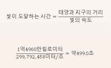 이 계산에 따르면 태양 빛이 지구에 도달하는 데 걸리는 시간은 약 8분 20초입니다. 이는 우리가 태양을 볼 때 실제로 약 8분 20초 전에 발생한 태양의 모습을 보고 있다는 것을 의미합니다.