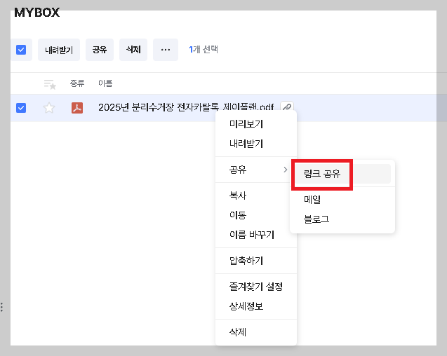 네이버 웹에서 MYBOX로 파일 공유하는 방법(가장간편하고 용량이 적은 경우 활용도 높음)