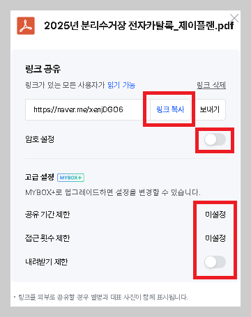 | ✅ 링크 공유 | 다운로드 가능한 공유 링크 생성 가능 (비밀번호 설정, 기간 지정 포함) |