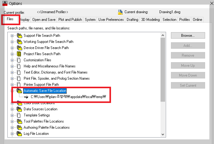 - 옵션 메뉴로 들어가 자동 저장 파일 경로를 확인합니다.