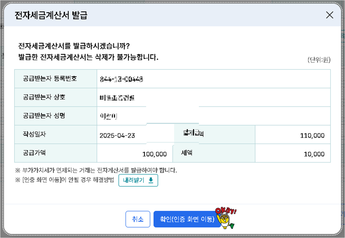 이상이 없다면 '발행하기' 버튼을 클릭하여 전자세금계산서를 발행합니다.