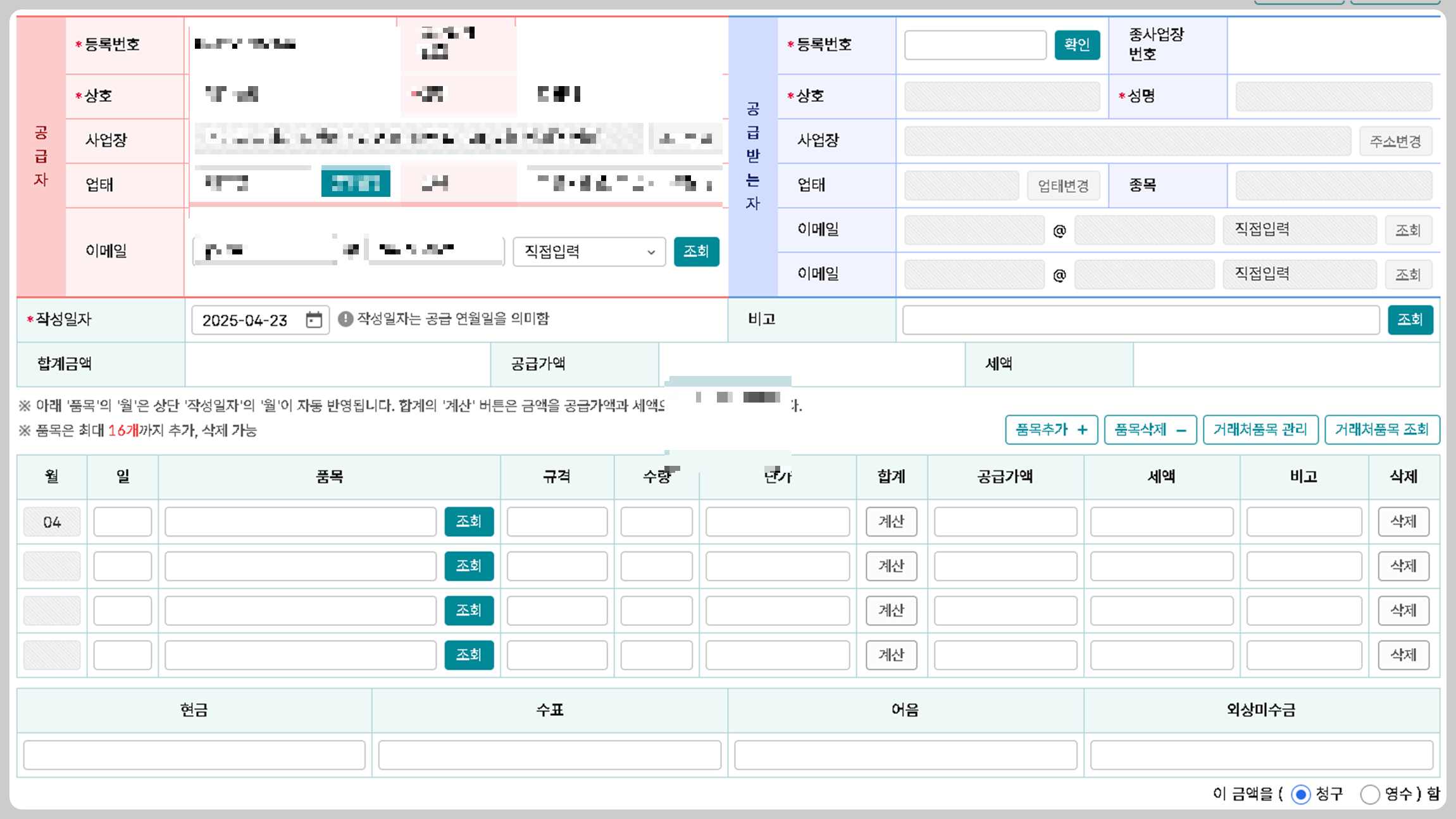 - 거래 내용: 품목, 수량, 단가, 공급가액, 세액 입력