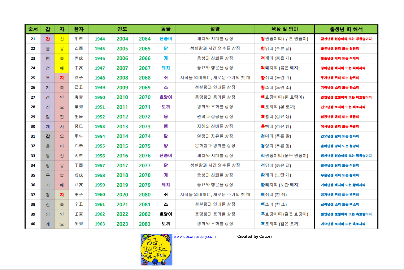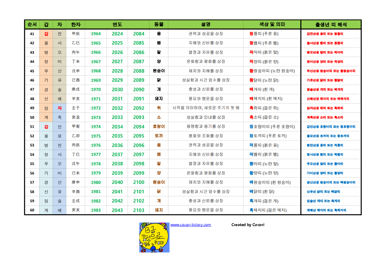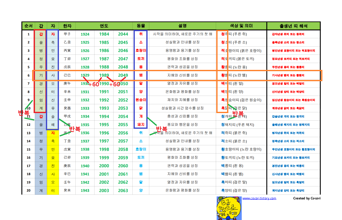 예를들어 표에서와 같이 1929년생 + 60년 = 1989년생 + 60년 = 2049년생은 같은 갑자년 생이 되는 것입니다.