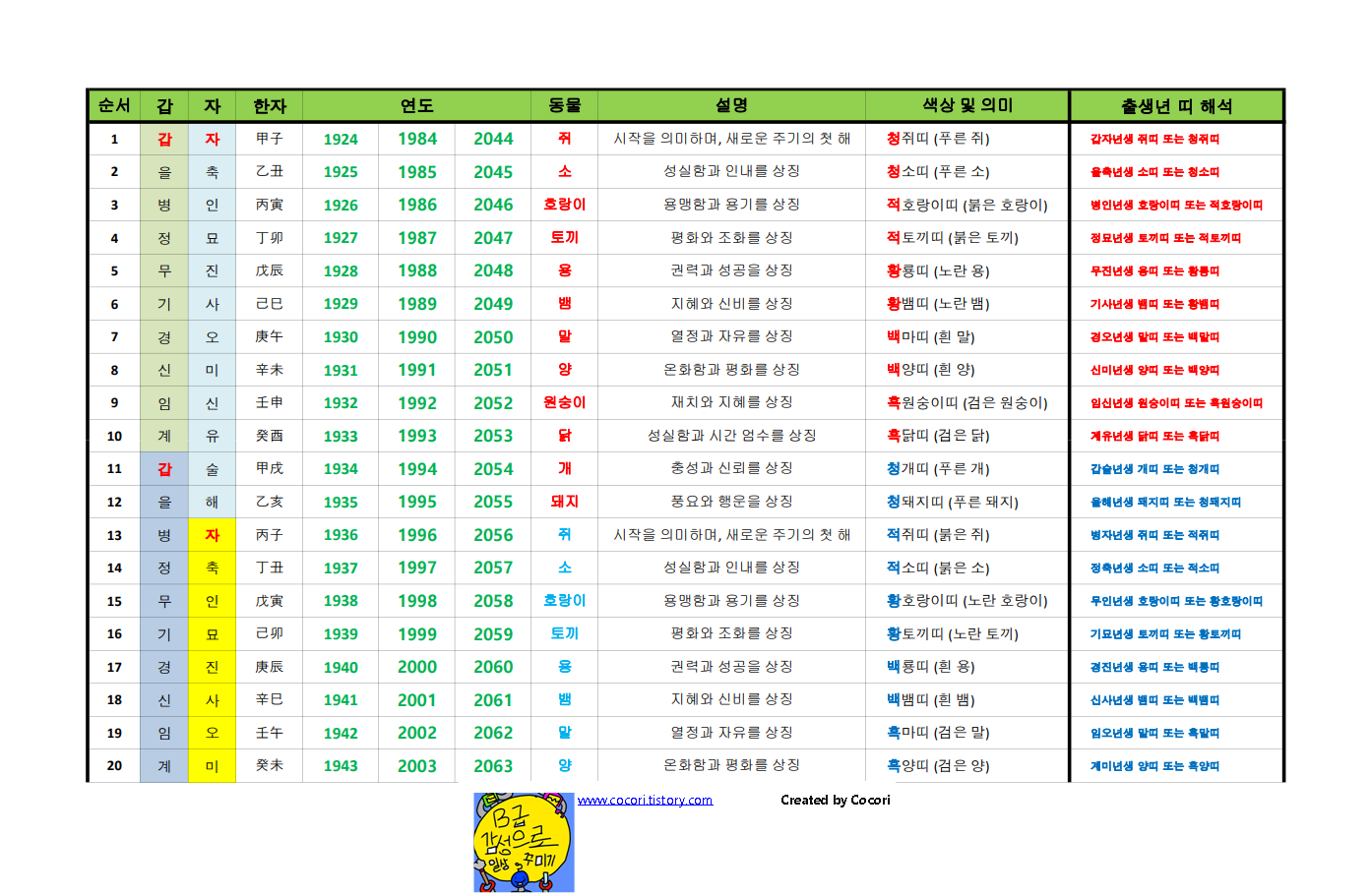 예를들어 표에서와 같이 1929년생 + 60년 = 1989년생 + 60년 = 2049년생은 같은 갑자년 생이 되는 것입니다.