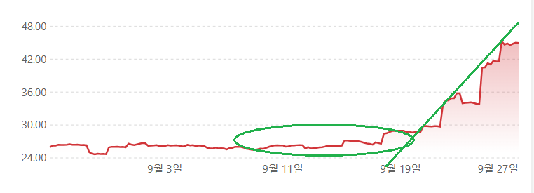 그래프를 보면 9월 11일 부근 부터 변화가 감지 되었습니다. 9월 19일경 부터 급격한 상승을 하고 있습니다.