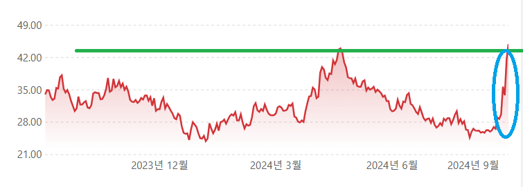 멀리보면 아직도 갈길이 멀지만 최근 중국의 경기부양책등을 발표하면서 단기적으로 급격한 상승을 보이고 있어 이목을 집중 시키고 있습니다. CWEB은 45달러 부근에서 저항이 있으므로 지금 위치에서 무조건 접근하기 보다는 조심하면서 잘 관찰해야 할 것 같습니다. 만약 강하게 돌파하면 단기적으로 70달러 부근까지 노려볼 만 합니다.