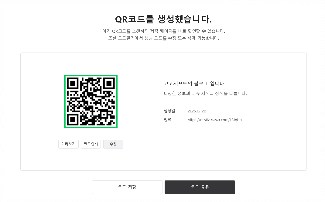 URL 링크 기본정보 작성후 "다음" 을 누르면 QR코드 생성완료