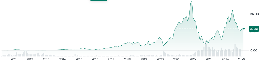 위 그래프는 5년 그래프입니다. 2022년 최고점 이후 약 1년 정도 조정후 반등을 시작하여 2024년 7월경 고점을 찍은 후 다시 조정 구간으로 들어간 모습니다.