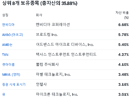 1.SOXL이 보유하고 있는 상위 8개 보유종목 (비중 35.88%) 2025년 1월 기준)